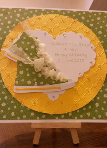I cut out a High Top with a Die-namics die in the patterned paper, yellow and white to co-ordinate with the card. I carefully thread ribbon through the holes so it looks like laces. The sentiment has been printed and cut out with a Sizzix heart die. The card had been completed with gems from my stash.